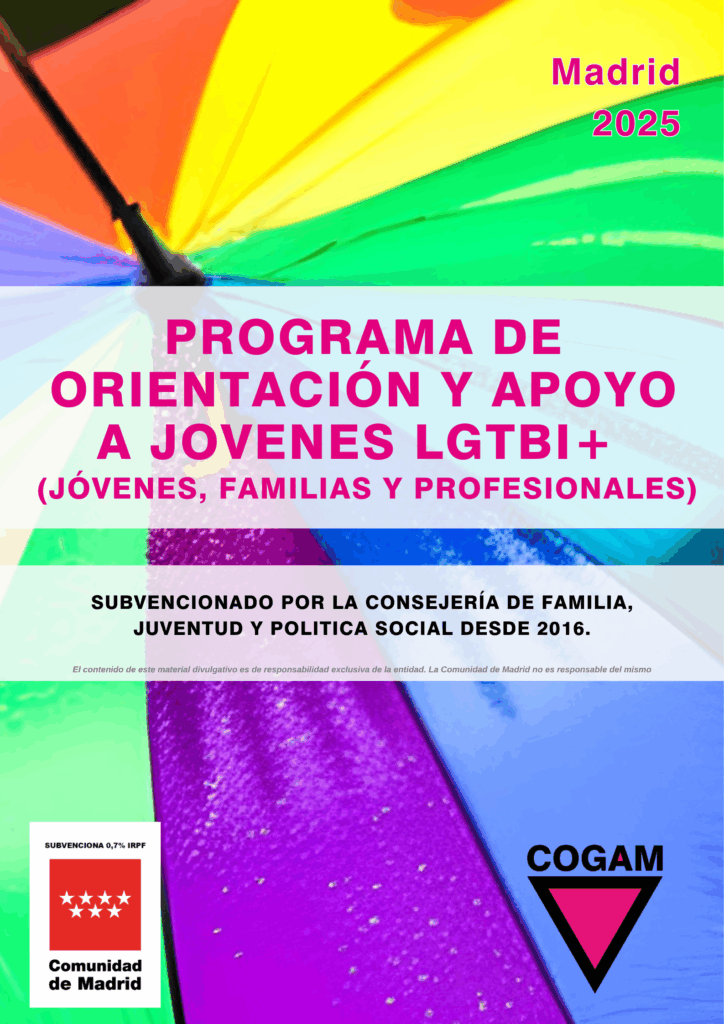 Si necesitas talleres de diversidad LGTB+ o de prevención de acoso LGTBfobo o materiales educativos para centros de educación formal de primaria o secundaria, contacta con Educación COGAM