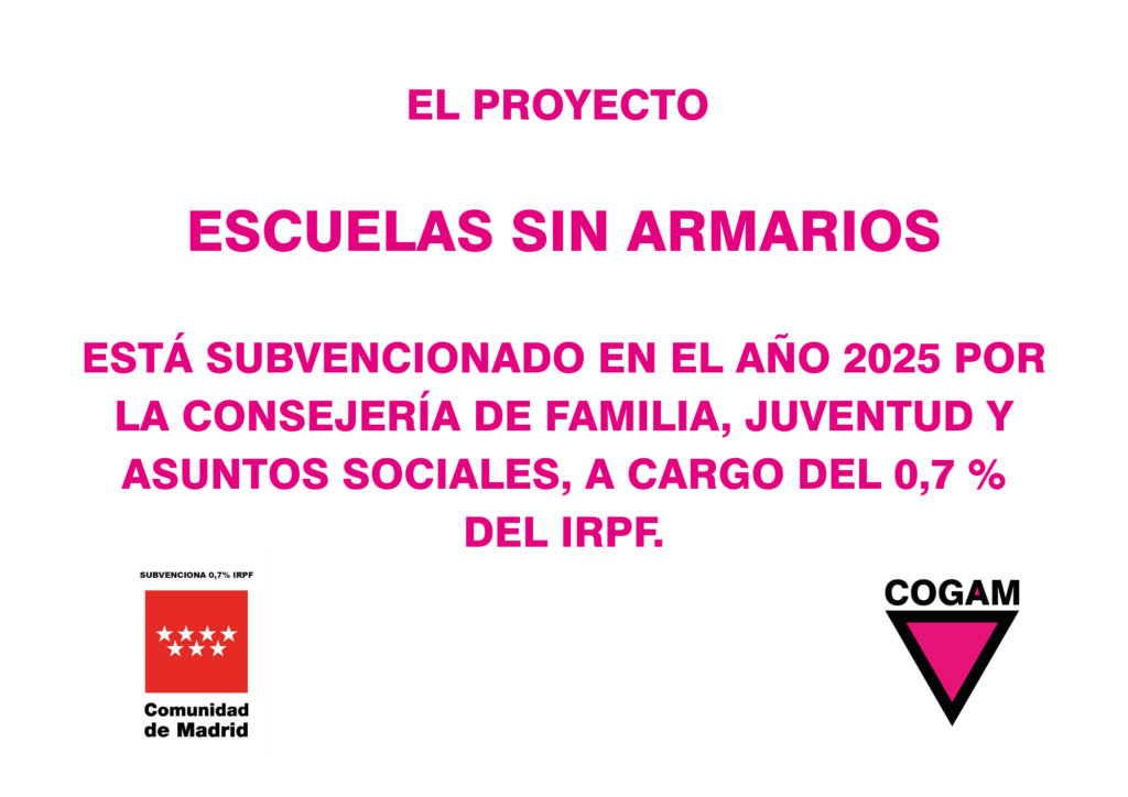 Nuestros talleres forman parte del proyecto Por una escuela sin armarios, subvencionado por la Consejería de Familia, Juventud y Política Social, dirigidos a la Comunidad Educativa. Los talleres tienen como objetivo fomentar un sistema educativo inclusivo y basado en el respeto hacia la diversidad y los Derechos Humanos y la integración del alumnado LGTB+.