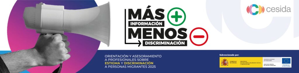 Los talleres impartidos bajo el nombre de ‘Orientación y asesoramiento a profesionales sobre el estigma y la discriminación múltiple de las personas migrantes’, en el marco de la iniciativa de Cesida ‘Más información, menos discriminación’ y subvencionado por el Ministerio de Inclusión, Seguridad Social y Migraciones y. cofinanciado por el Fondo Social Europeo +.